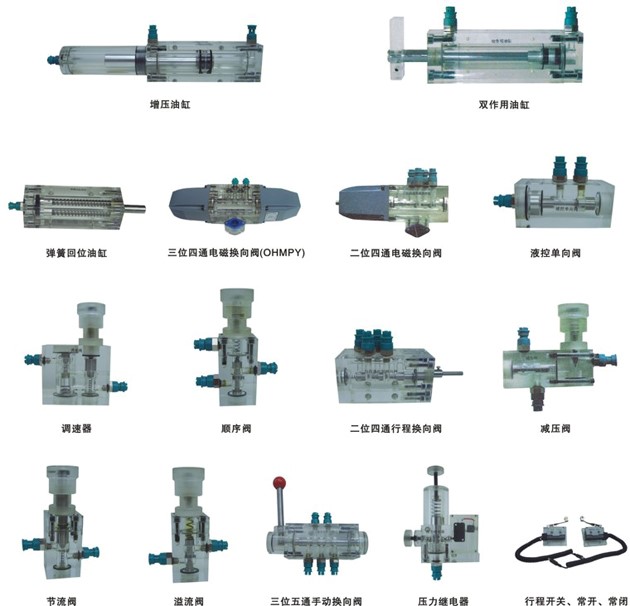 4、實驗元件均為透明有機(jī)材料制成,便于了解掌握幾十種常用液壓元件的結(jié)構(gòu),性能及用途。掌握幾十種基本回路的工作原理,實驗組裝回路快捷、方便。