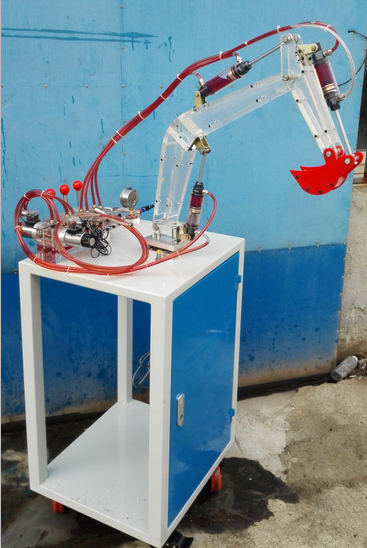 實訓臺主要由底柜,透明大臂,透明斗桿,透明挖斗(紅色),透明油缸,透明集成閥島,透明手動換向閥,透明電磁閥,旋缸馬達,減速器等成