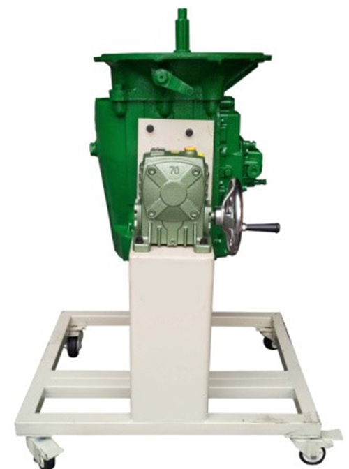 1.采用翻新天錦EQ1120GA2 8JS125TA型手動變速器總成(附件齊全,易于拆裝),并裝在專用翻轉(zhuǎn)架上。 采用減速翻轉(zhuǎn)機構(gòu),可使變速器旋轉(zhuǎn)任意角度,并能任意位置鎖止,便于學生從不同的角度進行拆卸和裝配。