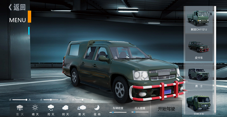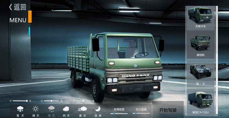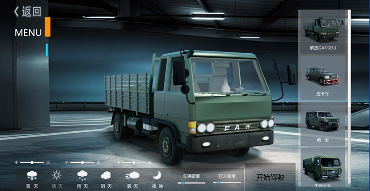 7.1、仿真車模型:10 種典型虛擬車輛模型:東風(fēng)猛士、北汽勇士、 EQ1118、EQ1121、 EQ2102、SX2150、SX2190、豪濼 ZZ2197、東風(fēng)天錦、大客車等,并可根據(jù)需要拓展、定制個(gè) 性化車輛模型。