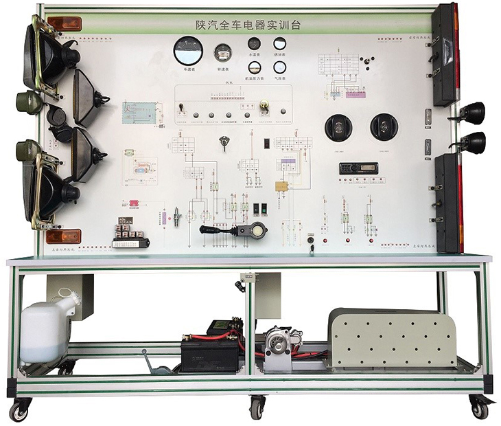 全車電器電路實(shí)訓(xùn)設(shè)備采用陜汽SX2220柴油機(jī)整車電器實(shí)物為基礎(chǔ),充分展示汽車儀表系統(tǒng)、燈光系統(tǒng)、雨刮系統(tǒng)、喇叭系統(tǒng)、發(fā)動(dòng)機(jī)電器系統(tǒng)、起動(dòng)系統(tǒng)和充電系統(tǒng)等汽車電器各系統(tǒng)的組成結(jié)構(gòu)和工作過程。