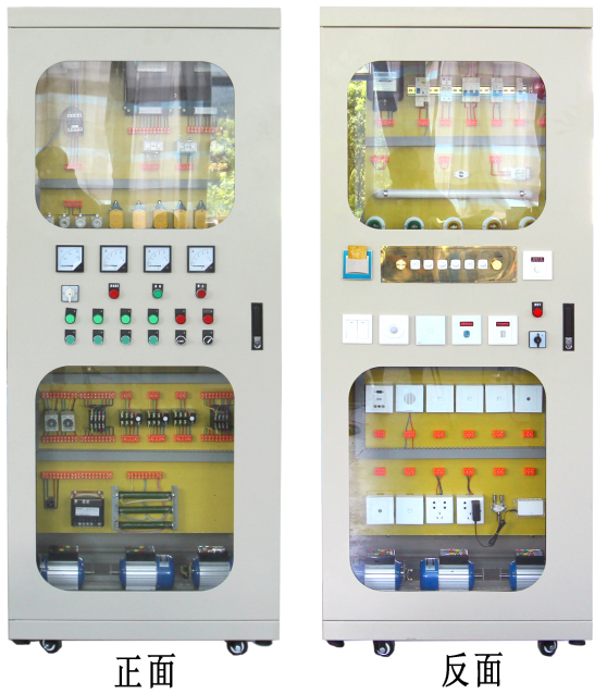 前后開門四玻電氣柜、柜內(nèi)按裝架、實訓(xùn)操作板、接線裝置、漏電斷路器、熔斷器、電流互感器、單相電度表、床頭控制面板、日光燈、白熾燈、單聯(lián)開關(guān)、單相異步電動機、門鈴、插卡取電插座、請勿打擾插座、聲光控延時開關(guān)、人體自動感應(yīng)開關(guān)、觸摸延時開關(guān)感應(yīng)開關(guān)、無線遙控開關(guān)、調(diào)光開關(guān)、燈座、插座、分配器、有線電視信息端座、音視頻信息端座、電話信息端座、網(wǎng)絡(luò)信息端座、三相四線有功電度表、接觸器、中間繼電器、時間繼電器、熱繼電器、行程開關(guān)、按鈕、信號燈、萬能轉(zhuǎn)換開關(guān)、電壓表、電流表、三相電機、聲光報警器、檢修開關(guān)、報警選擇開關(guān)和故障開關(guān)等。