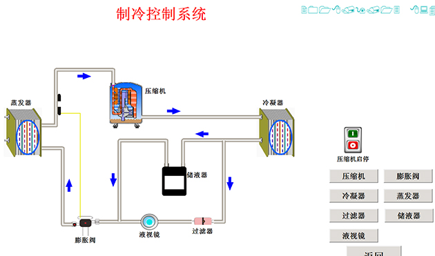 5、工作流程圖板3套:工作流程圖板詳細(xì)說明制冷系統(tǒng)流程、監(jiān)測點溫度、系統(tǒng)壓力、工作狀態(tài)指示、系統(tǒng)部件說明。