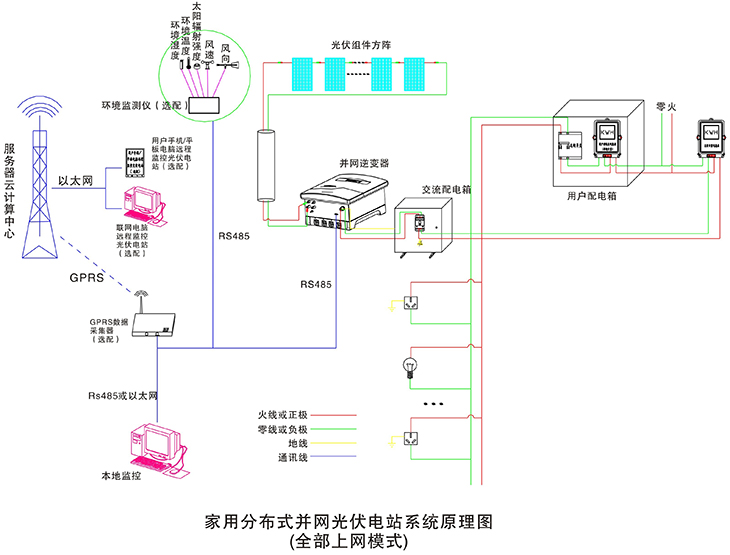 在晴朗的白天,裝在屋頂上的光伏組件發(fā)出的直流電經過并網逆變器逆變成與電網同頻率同相位的單相交流電給負載進行供電,在夜晚或陰雨天等太陽光照不足的情況下,系統(tǒng)處于待機狀態(tài),負載用電全部來自電網。您可以通過系統(tǒng)監(jiān)控軟件來實時查看系統(tǒng)的運行狀態(tài)和故障信息,或者是選配遠程通訊數據采集器,將系統(tǒng)工作數據通過GPRS或以太網,傳輸到您的手機、平板電腦或任意一臺聯網的電腦,以便于您遠程實時掌控電站的信息。