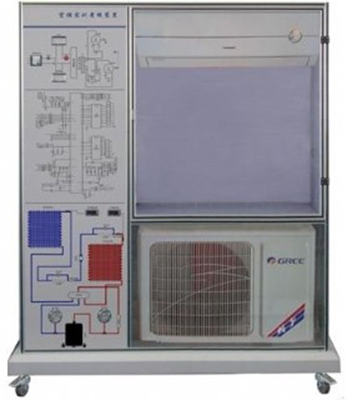 2.裝置直觀展示了變頻空調(diào)的系統(tǒng)結(jié)構(gòu)和工作原理,便于教學(xué)演示講解及學(xué)生對課本知識的理解掌握。配置的交流電壓表、交流電流表、溫度表、真空壓力表以及相應(yīng)的信號指示燈,使整個變頻空調(diào)系統(tǒng)的實時工作狀態(tài)一目了然;主面板中間印有電氣控制系統(tǒng)原理圖,并設(shè)有相應(yīng)測試點;屏背面可觀察到整個制冷系統(tǒng)結(jié)構(gòu)原理以及主要部件的實際物體,相應(yīng)部件均有名稱標(biāo)識;并設(shè)有視液鏡,可觀察制冷劑狀態(tài)