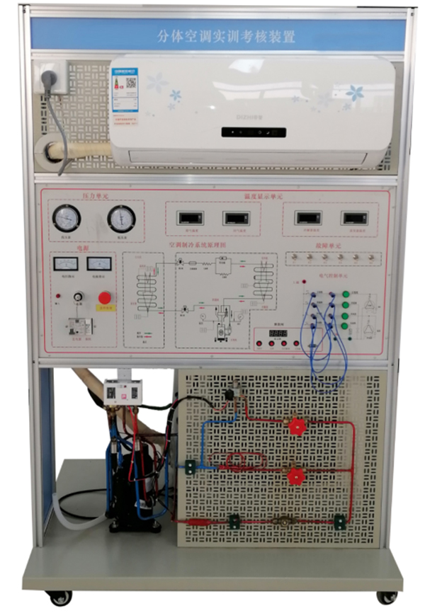 2、裝置直觀展示了空調(diào)的系統(tǒng)結(jié)構(gòu)和工作原理,便于教學(xué)演示講解及學(xué)生對(duì)課本知識(shí)的理解掌握。配置的交流電壓表、交流電流表、溫度表、真空壓力表以及相應(yīng)的信號(hào)指示燈,使整個(gè)空調(diào)系統(tǒng)的實(shí)時(shí)工作狀態(tài)一目了然;