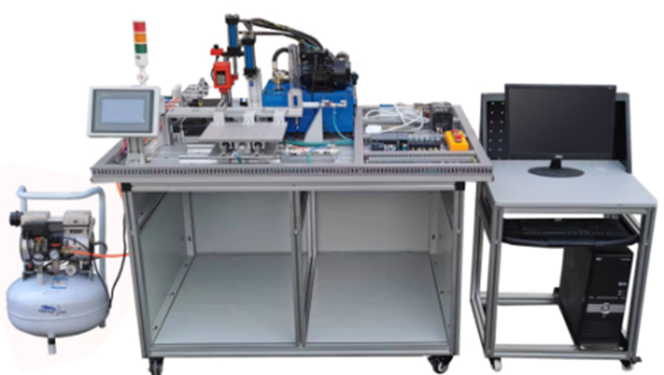 機電液氣一體化綜合實訓考核裝置實訓工作臺架為鋁合金型材結(jié)構(gòu),在上面可安裝上料單元、間歇式傳送及夾緊單元、沖壓單元、鉆孔單元和分揀單元,并配有PLC主機、變頻器、觸摸屏、傳感器、三相異步交流電機、交流減速電機、直流電機、液壓機系統(tǒng)、鉆機及其液壓進給系統(tǒng)、氣壓傳動系統(tǒng)等,構(gòu)成一個典型的機電氣液綜合應用系統(tǒng)?梢赃M行典型機電氣液一體化系統(tǒng)的安裝、液壓氣動管路安裝、電氣控制線路布線、觸摸屏與PLC編程及調(diào)試、整機調(diào)試及運行等技能訓練,從而使學生掌握機電氣液的相關(guān)知識和技能。