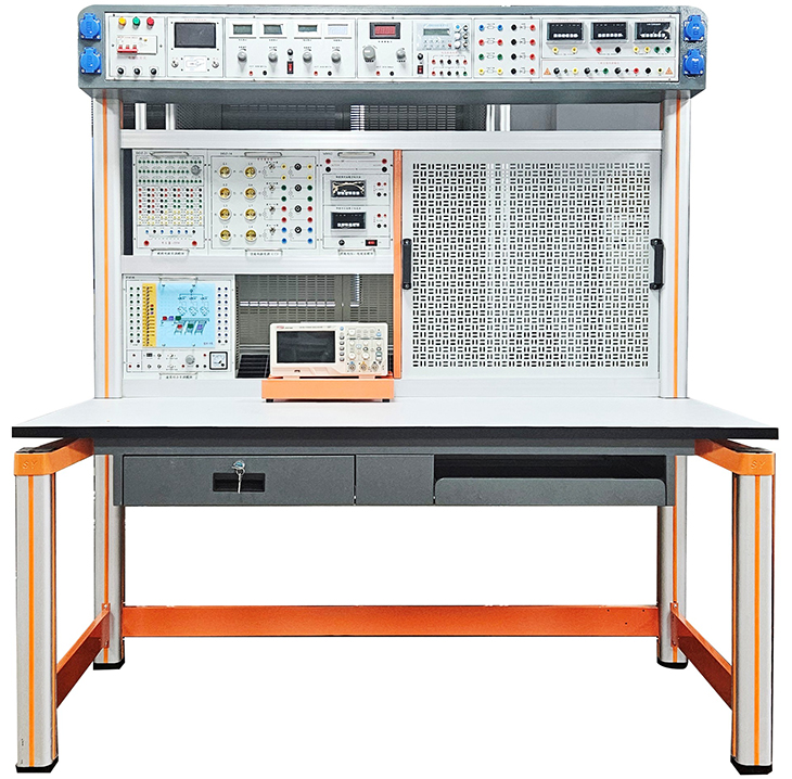 實(shí)驗(yàn)桌后面二支桌腳向上延伸,配上特制拉模成型的帶滑槽橫梁鋁型材組成實(shí)訓(xùn)屏,實(shí)訓(xùn)時(shí)左邊放置電氣實(shí)訓(xùn)掛箱(2層)及示波器支架,右邊裝置網(wǎng)孔板等,實(shí)訓(xùn)掛箱、網(wǎng)孔板在實(shí)訓(xùn)屏上實(shí)訓(xùn)時(shí)上下方便,左右移位自如。實(shí)訓(xùn)屏頂部安裝主機(jī)箱,實(shí)訓(xùn)屏底部安裝實(shí)驗(yàn)儀器工作電源箱。