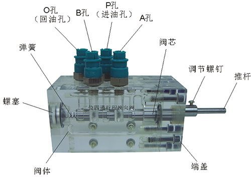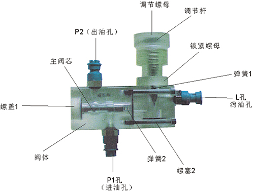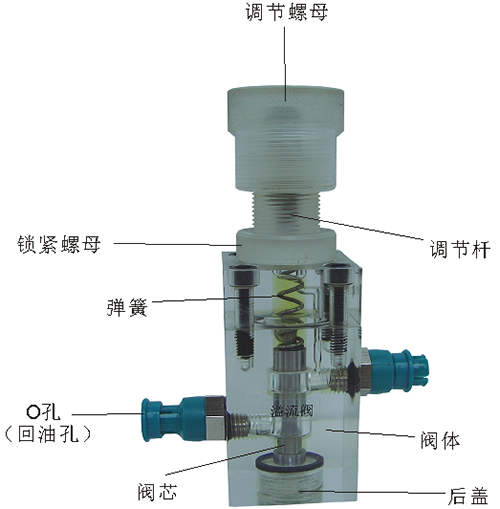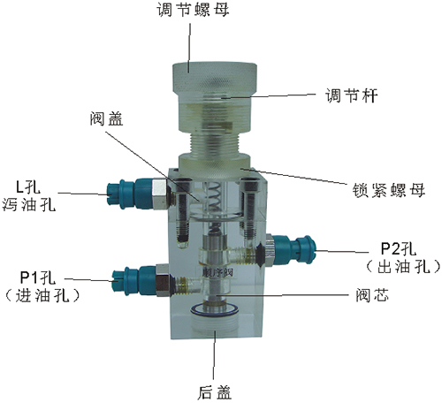 2、溢流閥結(jié)構(gòu)上參考了國(guó)產(chǎn)P-63B型低壓直動(dòng)式溢流閥,其閥體閥蓋、鎖緊螺母、調(diào)節(jié)螺母、螺塞等采用了進(jìn)口透明有機(jī)玻璃材料精制而成,閥芯、調(diào)節(jié)桿采用了45#中碳鋼材料。并配合彈簧,油接頭,密封圈等標(biāo)準(zhǔn)件裝配而成,通過它可明確地觀察到閥芯、彈簧、油孔等結(jié)構(gòu)及其運(yùn)行過程,具有形象逼真,性能可靠等優(yōu)點(diǎn)。它即可作為教學(xué)模型,也可以作為液壓實(shí)驗(yàn)元件進(jìn)行實(shí)驗(yàn)演示。